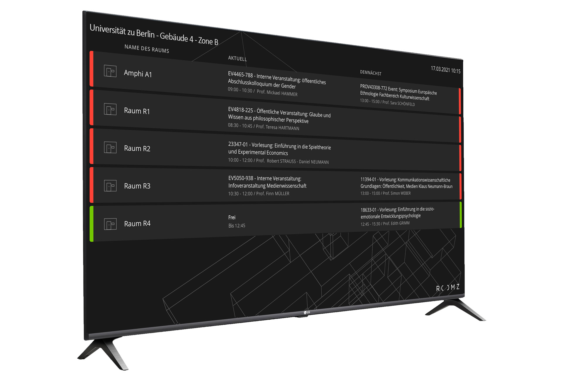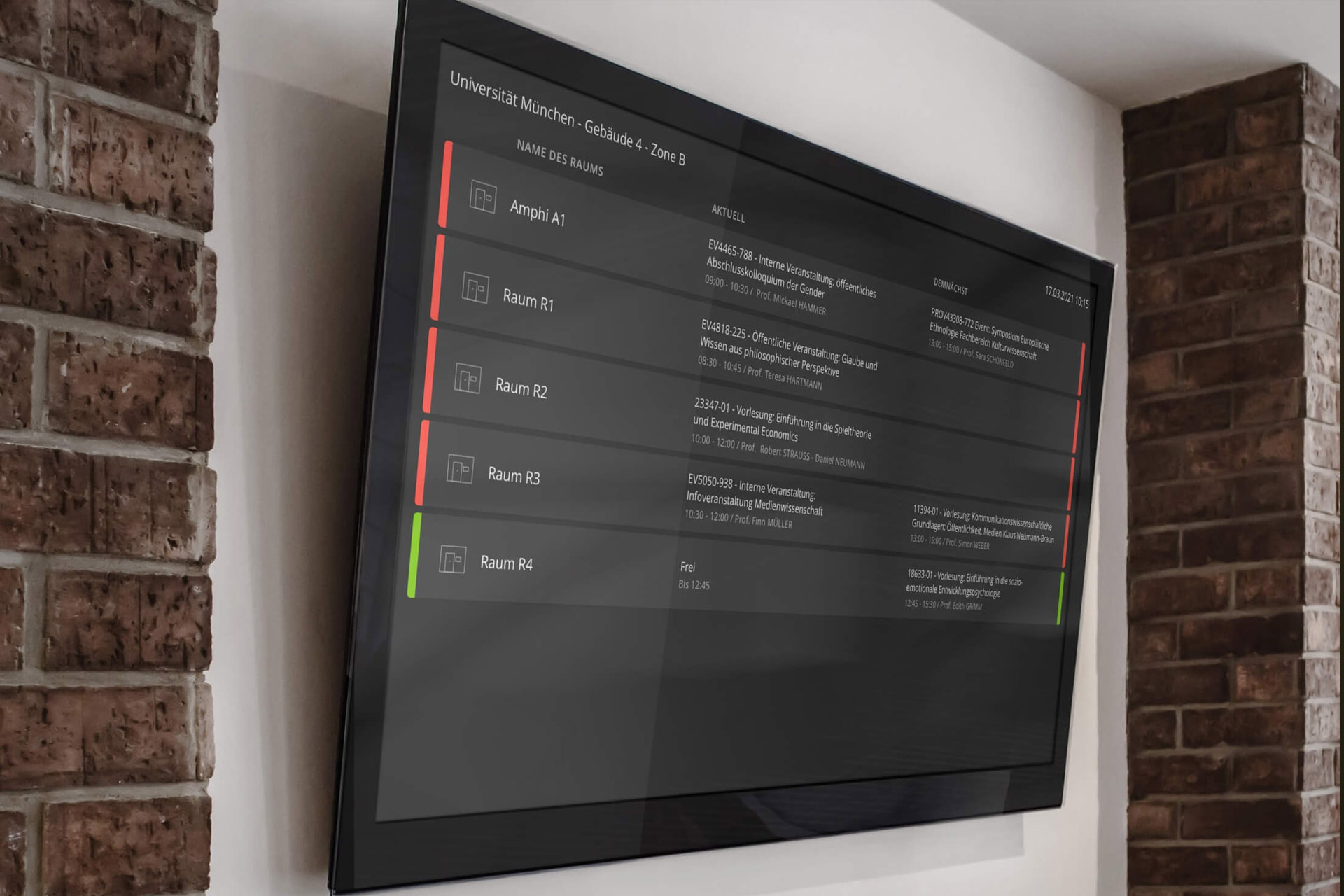 Mit ROOMZ werden Raumbelegung und Stundenpläne automatisch synchronisiert und die Änderungen werden sofort sichtbar – direkt am Raum und auf zentralen Displays.